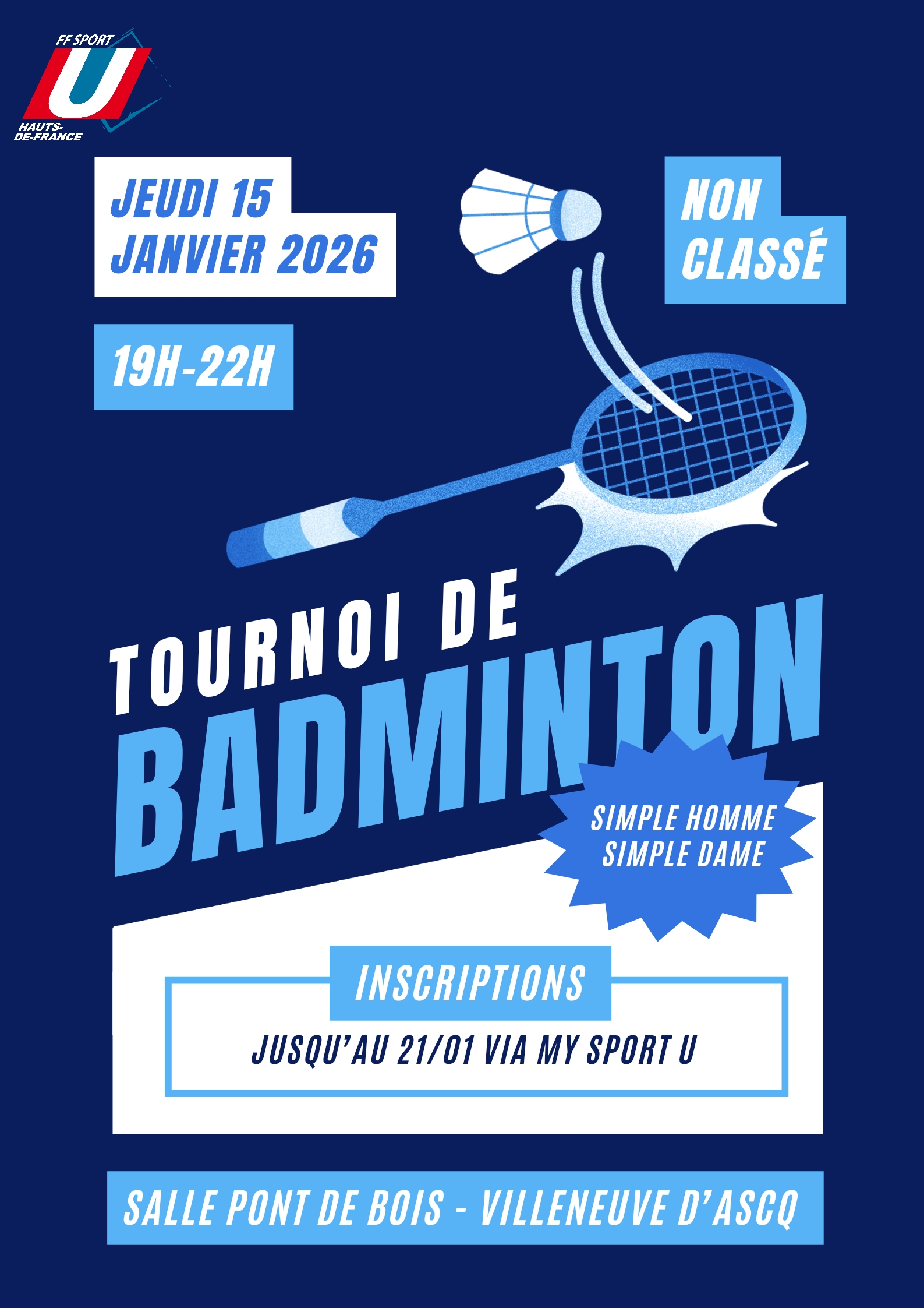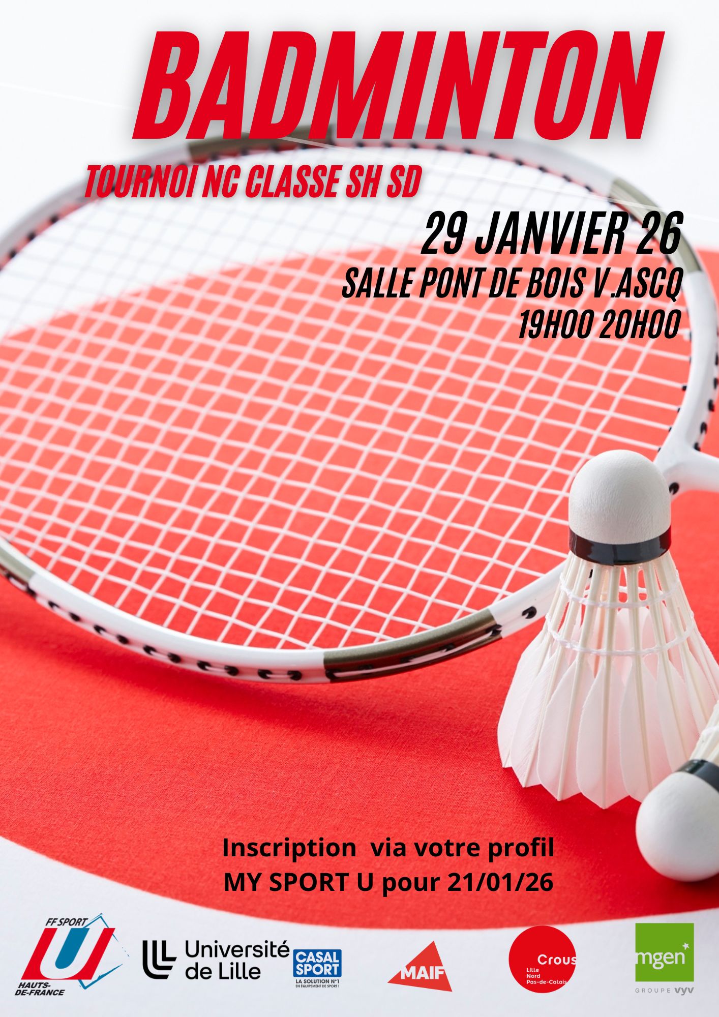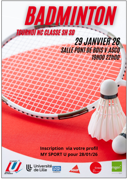 TOURNOI SH / SD NC Inscriptions jusqu’au 14/01/26 via votre espace licencié MY SPORT U |