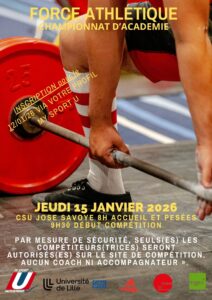 LILLE – CSU JOSE SAVOYE LILLE JEUDI 29 JANVIER 2026 INSCRIPTION JUSQU’AU 26/01 VIA VOTRE PROFIL MY SPORT U Par mesure de sécurité, seuls(es) les compétiteurs(trices) seront autorisés(es) sur le site de compétition. Aucun coach ni accompagnateur ». |